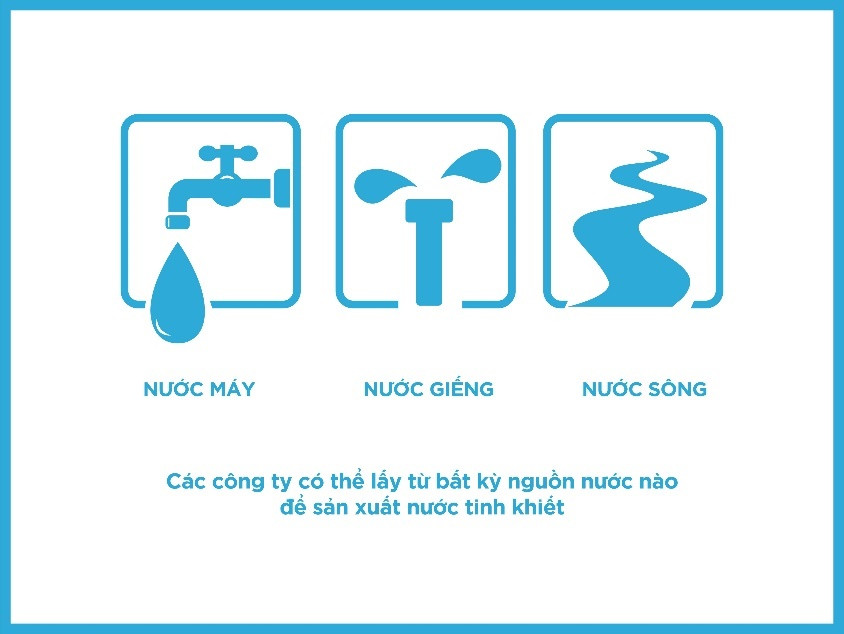 Các công ty thường sử dụng nước từ bất kỳ nguồn nào, như nước máy, nước giếng và nước sông để sản xuất nước tinh khiết.