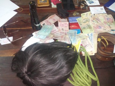 Mũi công tác tiến đến tầng 1 của khách sạn, phát hiện một thanh niên có biểu hiện nghi vấn trốn phía sau chậu hoa ngoài lan can đã khống chế, thu 2 roi điện, 2 đoản phá khóa, bộ tóc giả, 2 cuộn dây dù, 2,5 triệu đồng, dây nịt, 112 USD, 2 Chứng minh nhân dân...