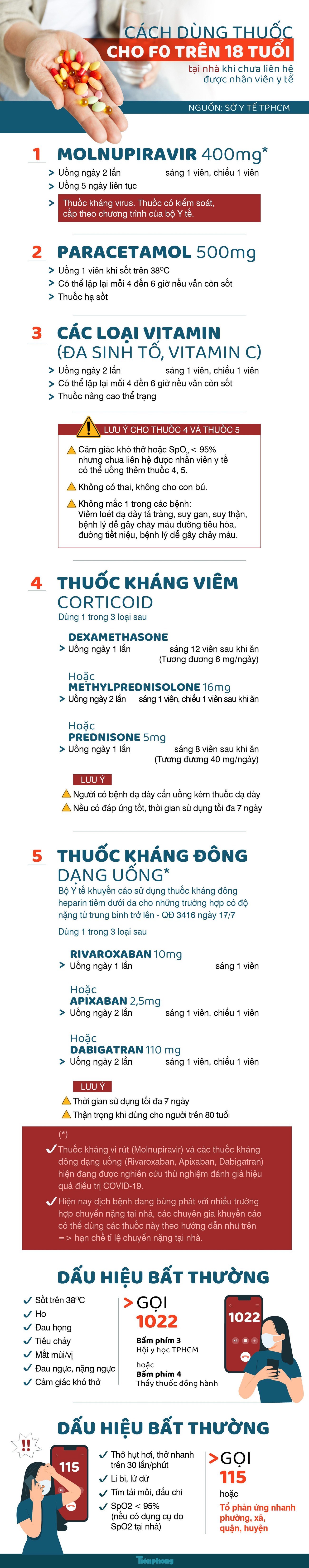 TPO - Sở Y tế TPHCM vừa có công văn gửi các cơ sở y tế trực thuộc "Hướng dẫn gói chăm sóc sức khỏe tại nhà cho người F0" phiên bản 1.3. Theo đó, Sở Y tế TPHCM đã cập nhật thêm cách dùng thuốc kháng virus Molnupiravir cho F0 tại nhà, giúp hạn chế bệnh nhân trở nặng và giảm tỷ lệ tử vong hiện nay.