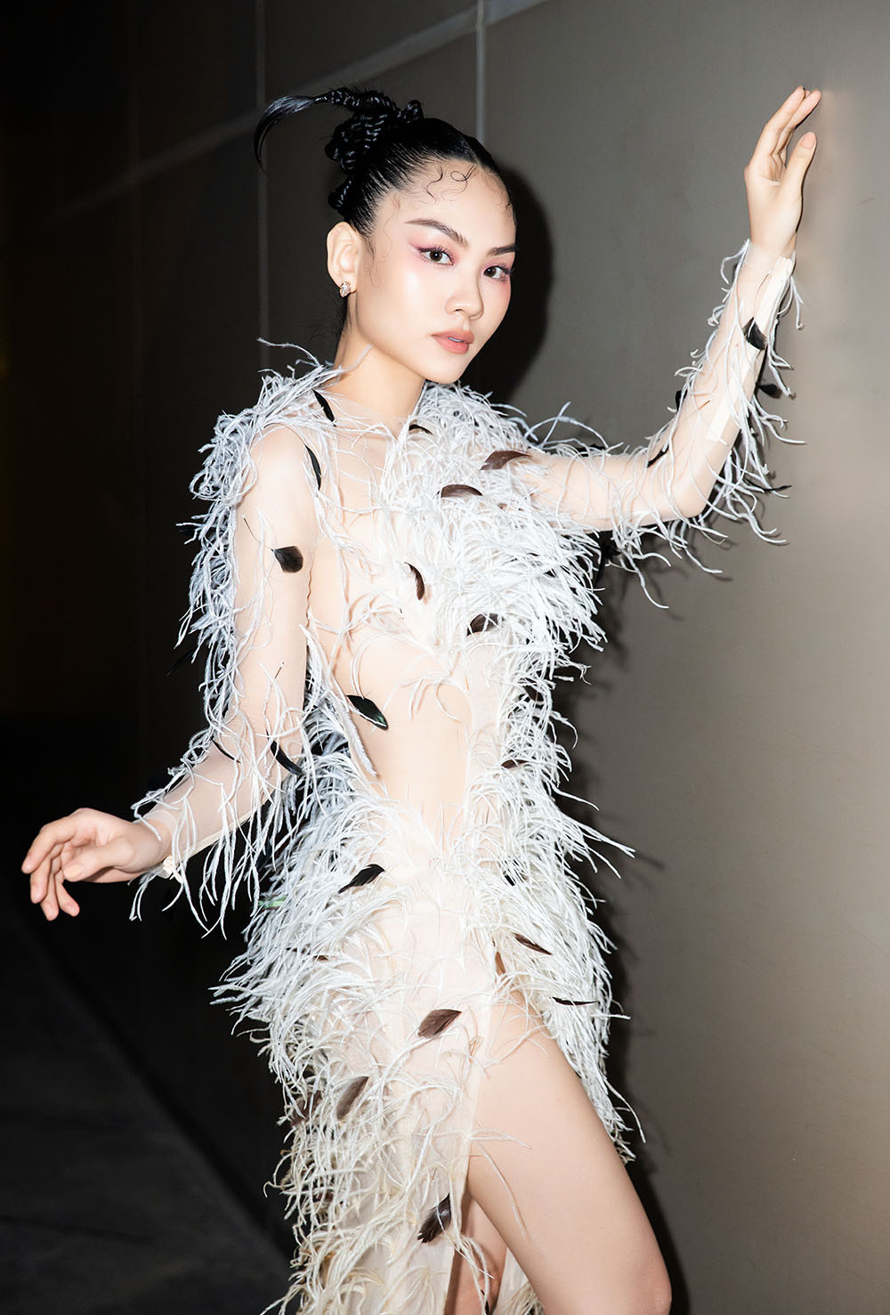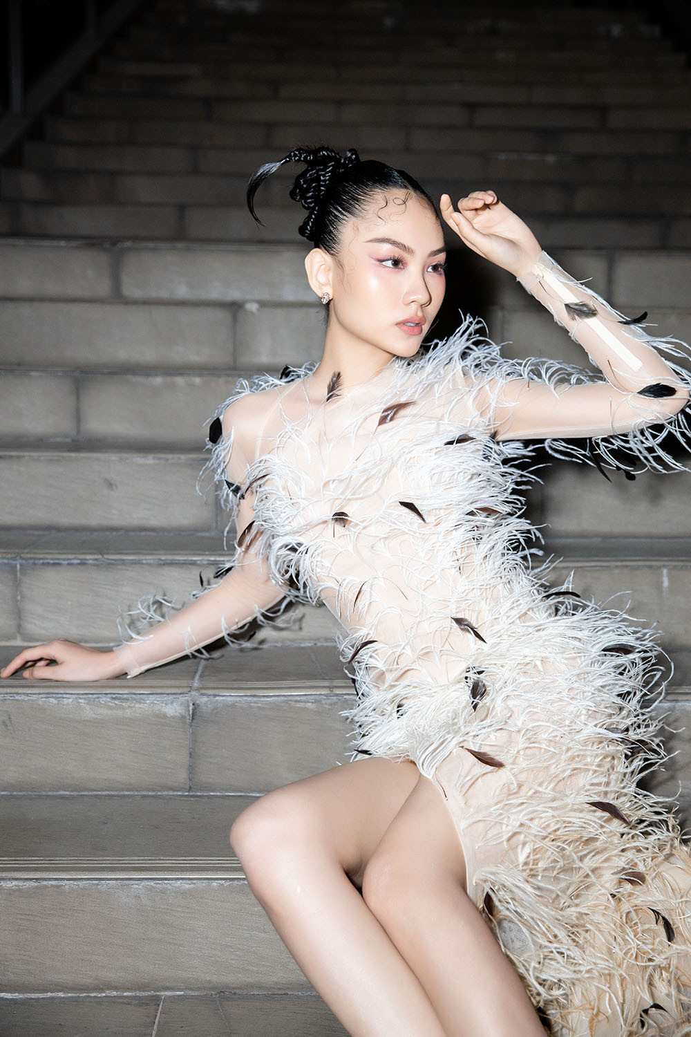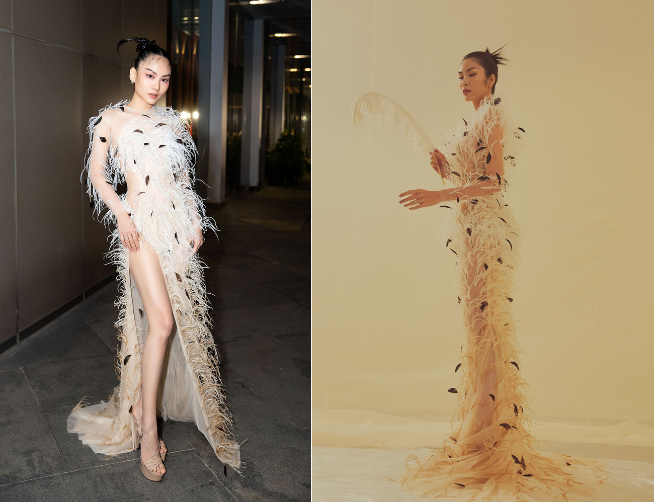 Bộ váy đính kết lông vũ và có những khoảng hở xuyên thấu nhẹ giúp người đẹp khoe đôi chân thon dài cùng vóc dáng chuẩn.