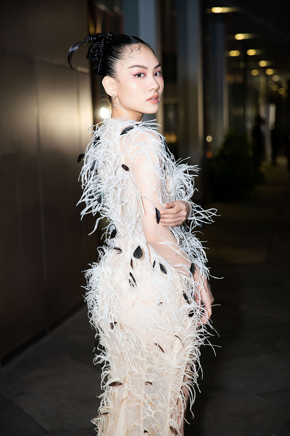 Trên thảm đỏ, người đẹp toả sáng với bộ váy đính lông vũ màu trắng cầu kỳ của nhà thiết kế Lê Thanh Hoà.