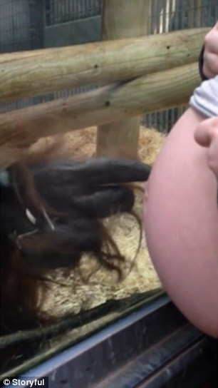 Ngay khi nhìn thấy cô, Rajang lập tức nhìn bụng Bettany, dùng tay vuốt ve bụng bầu qua tấm kính. Rajang còn có hành động hôn lên bụng bầu vô cùng dễ thương.