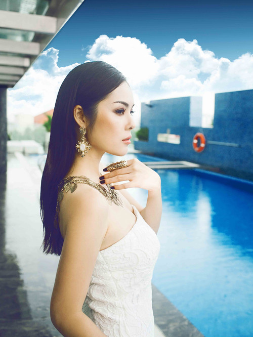 Diễn xuất bên hồ bơi, Cẩm Lynh trông như nàng tiên cá đang tư lự một mình.