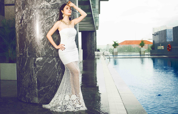 Cẩm Lynh tạo dáng trên một cao ốc giữa trung tâm TP HCM.
