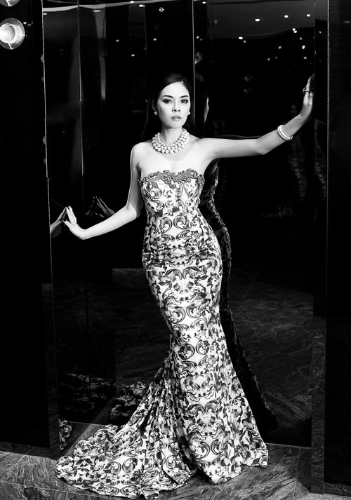 Bộ váy dạ hội dáng đuôi cá được cắt xẻ táo bạo, làm lộ nhiều khoảng da thịt gợi cảm của người đẹp.
