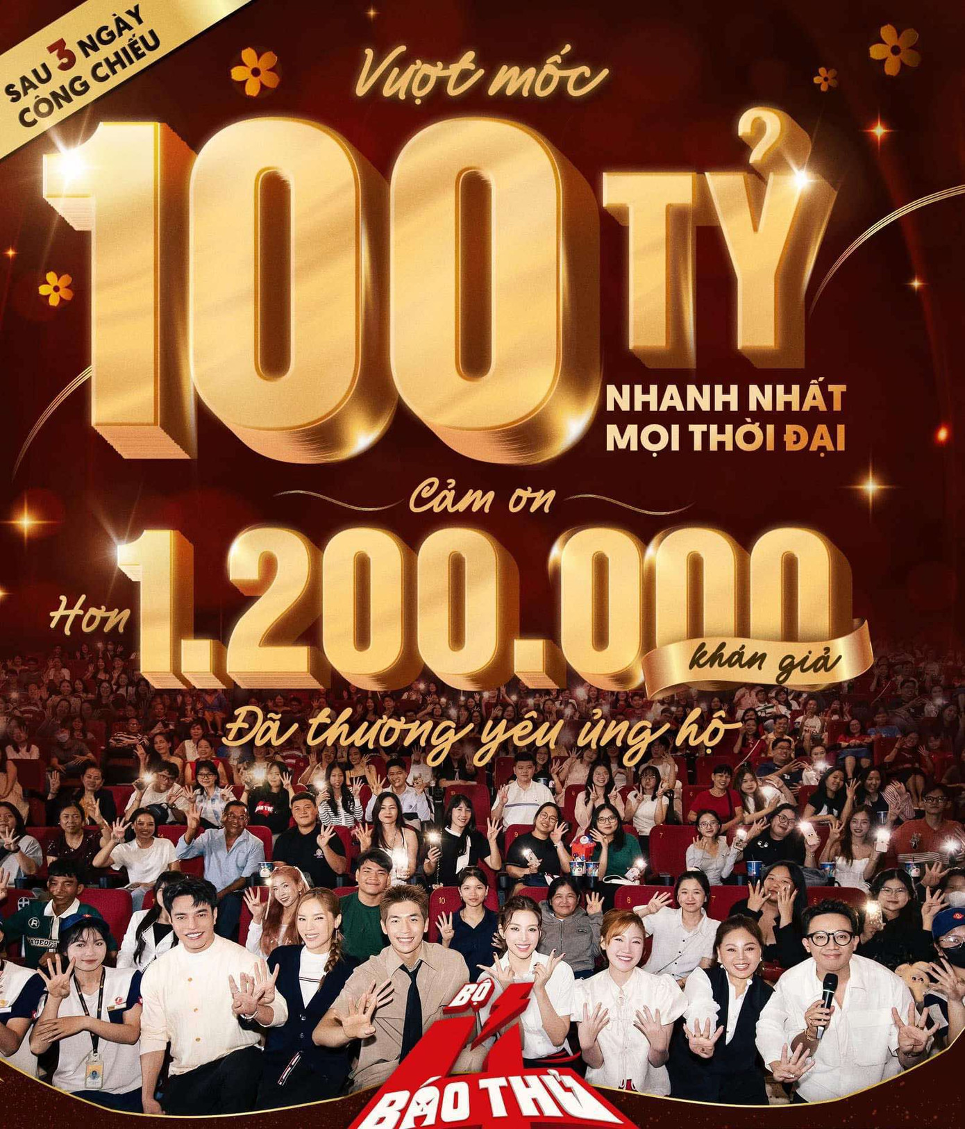 Trước đó, trưa 1/2, đạo diễn Trấn Thành thông báo "tin vui" trên fanpage: Bộ Tứ Báo Thủ tiếp tục "vượt mặt" thành tích của Mai, trở thành phim điện ảnh Việt cán mốc 100 tỷ nhanh nhất mọi thời đại. "Thật sự nhìn con số kỷ lục chính tôi cũng bất ngờ. Cảm ơn quý vị đã yêu thương" - Trấn Thành chia sẻ.
