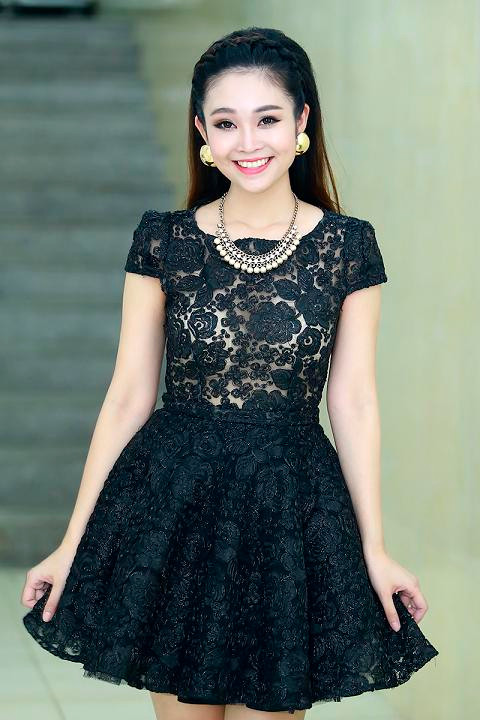 MC Thùy Linh diện váy ren đen kiểu dáng xòe trẻ trung và xinh đẹp.