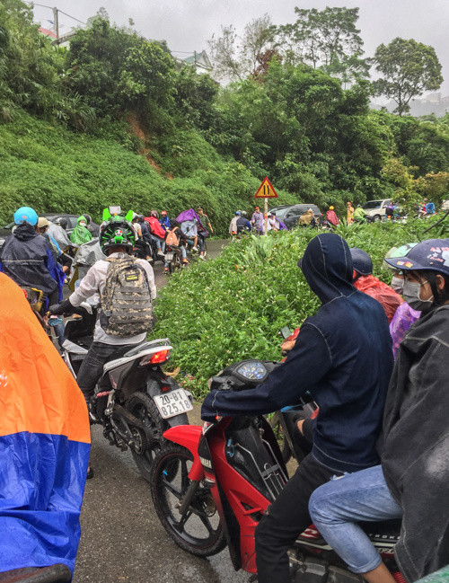 Các phương tiện đứng chờ ở đoạn dẫn lên tháp truyền hình. Về trưa, lượng người đổ về thị trấn ngày càng đông. Anh Đặng Viết Thắng (Vĩnh Phúc) kể, anh mất gần hai tiếng để đi đoạn đường dài 2 km bằng ôtô, trong khi ngày thường mất khoảng 10 phút.