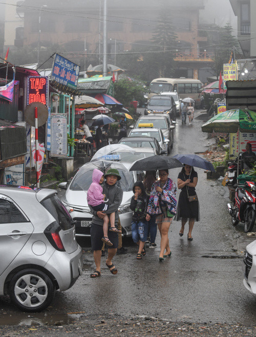 Cơn mưa rào đổ xuống lúc 10h khiến việc đi lại của du khách khó khăn hơn, cảnh tắc đường diễn ra tại cả lối lên và xuống của khu du lịch. Ôtô, xe máy nối đuôi nhau thành hàng dài. Anh Nguyễn Tiến Toàn (Hà Nội) nói không nghĩ Tam Đảo sáng nay mưa vì thấy thời tiết dưới chân núi đã hửng nắng.