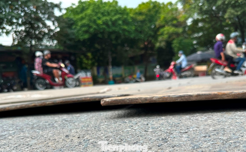| Một số đoạn công trường đơn vị thi công đã dỡ rào chắn nhưng mặt đường vẫn chưa được thảm lại, bịt bằng những tấm sắt lá. |