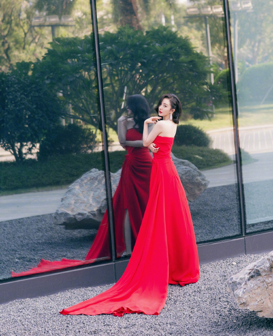 Trong ảnh, Dương Mịch trang điểm tỉ mỉ, nổi bật với màu son đỏ tươi. Mai tóc đen uốn xoăn vén một bên đầy nữ tính, kết hợp với bông tai hình lông vũ và dây chuyền màu bạc tạo nên một tổng thể hoàn hảo.