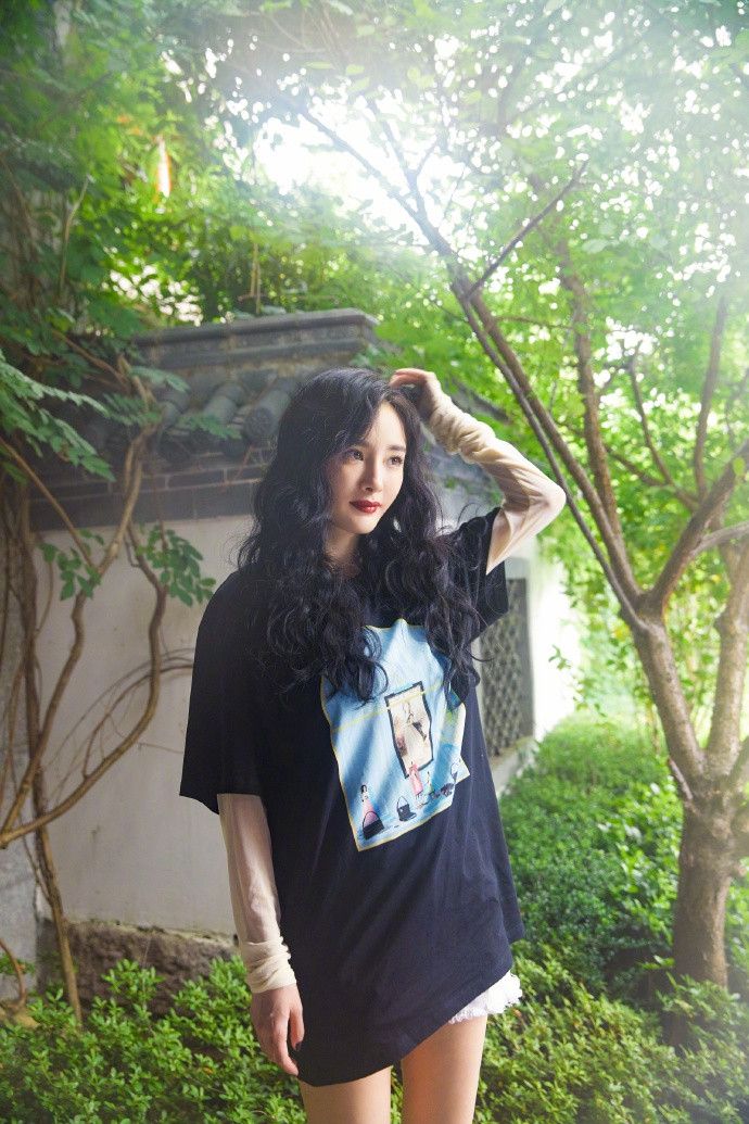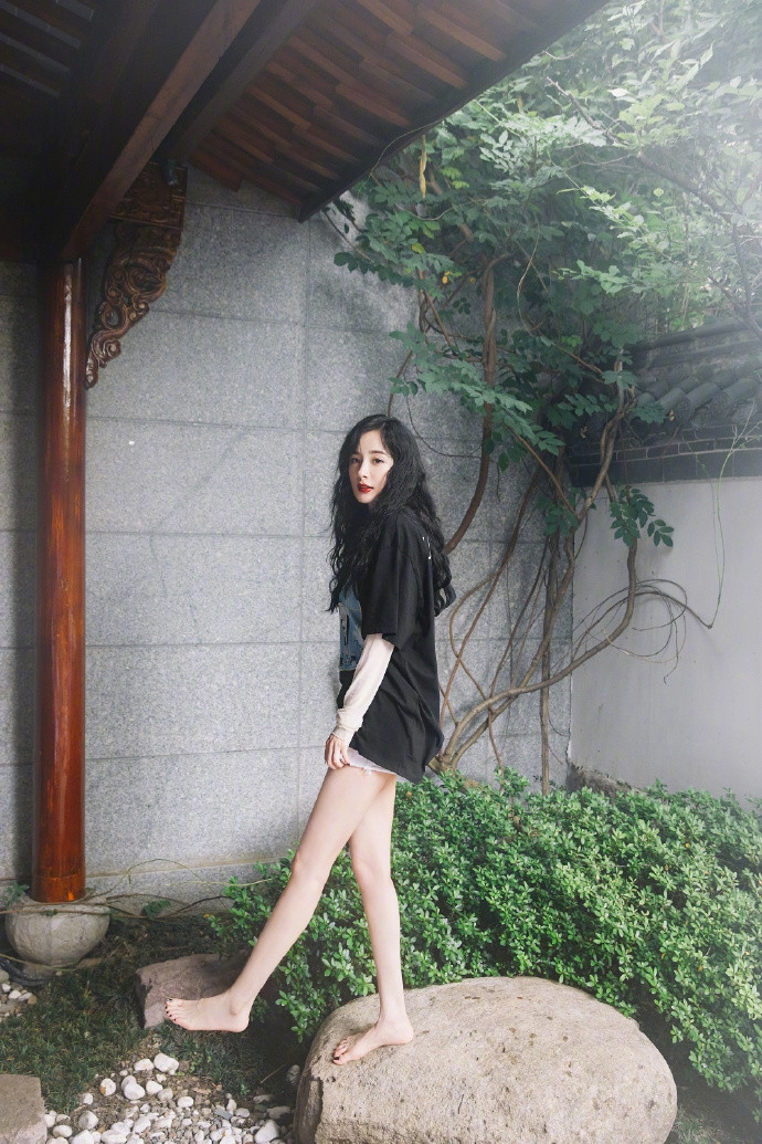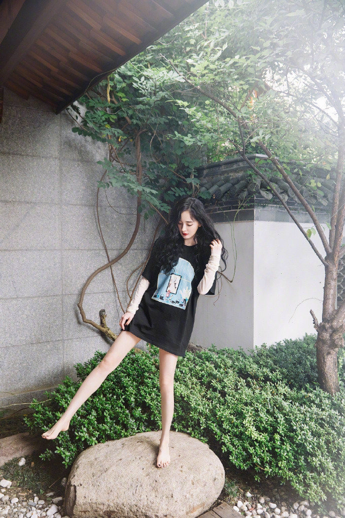 Trong ảnh, Dương Mịch mặc áo form rộng theo mốt quần "mất tích", chân trần đứng trên một tảng đá. Mái tóc dài đen uốn xoăn buông xoã và son môi đỏ làm bật làn da trắng như sứ của ngôi sao "Tam sinh tam thế: thập lý đào hoa".