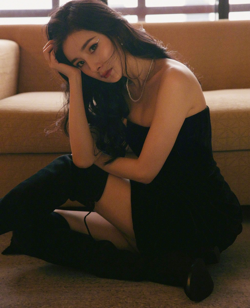 Nàng tiểu hoa đán diện váy cúp ngực, đi bốt cao khoe lợi thế hình thể là đôi chân thon dài.