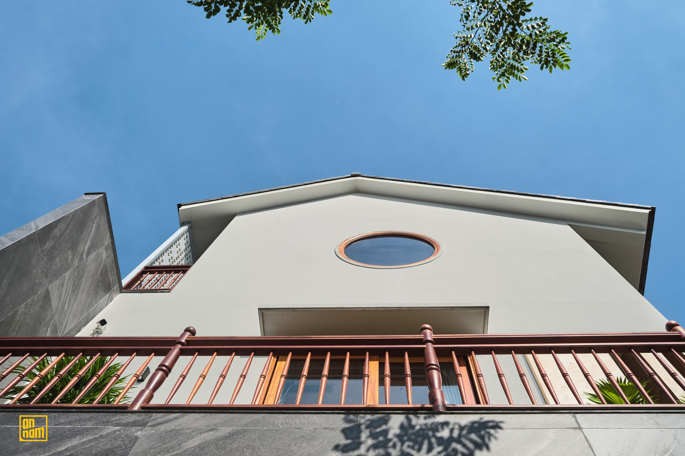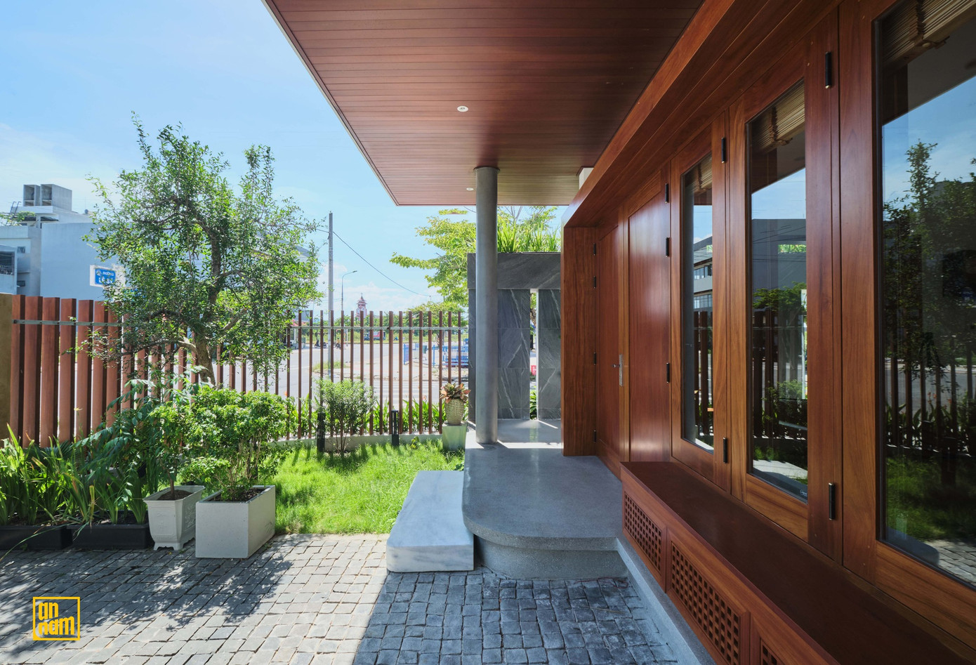 Khoảng lùi của hiên nhà được tạo ra, vươn ra hệ mái và ban công để làm giảm cũng như tránh ánh sáng trực tiếp từ hướng Tây vào công trình.