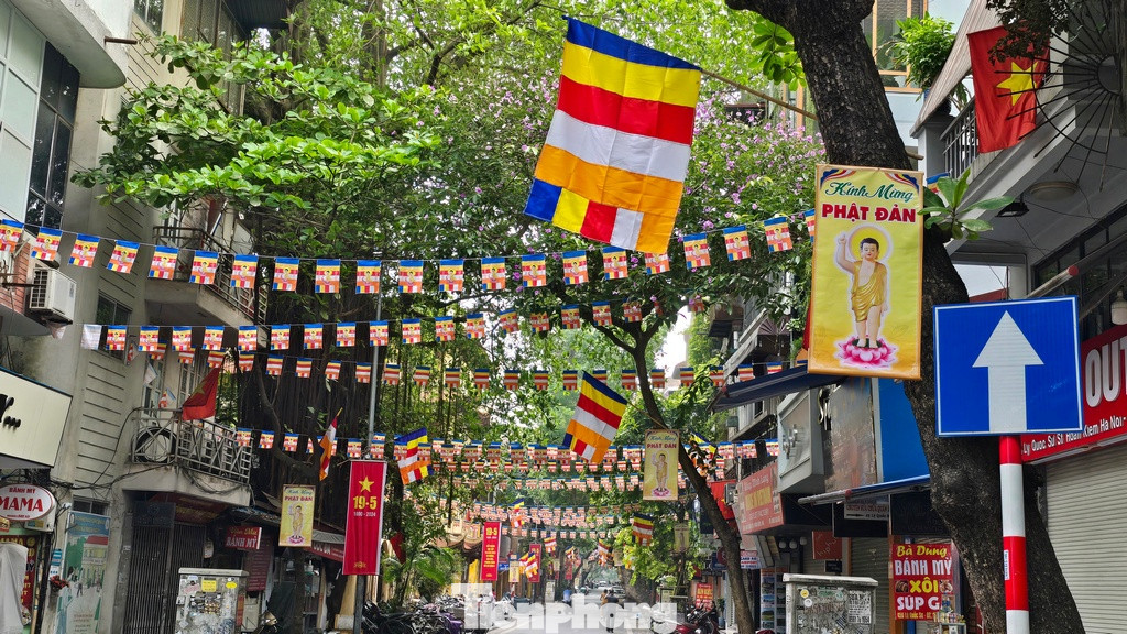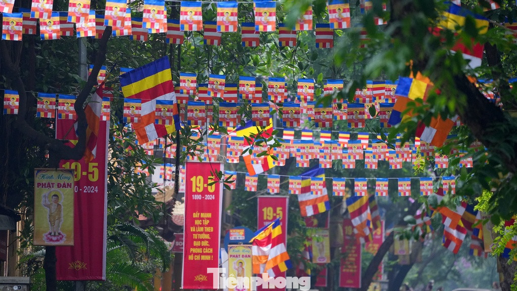 | Trên nhiều con đường, tuyến phố của Hà Nội, đặc biệt là khu vực gần chùa đều được trang trí rực rỡ cờ hoa. |