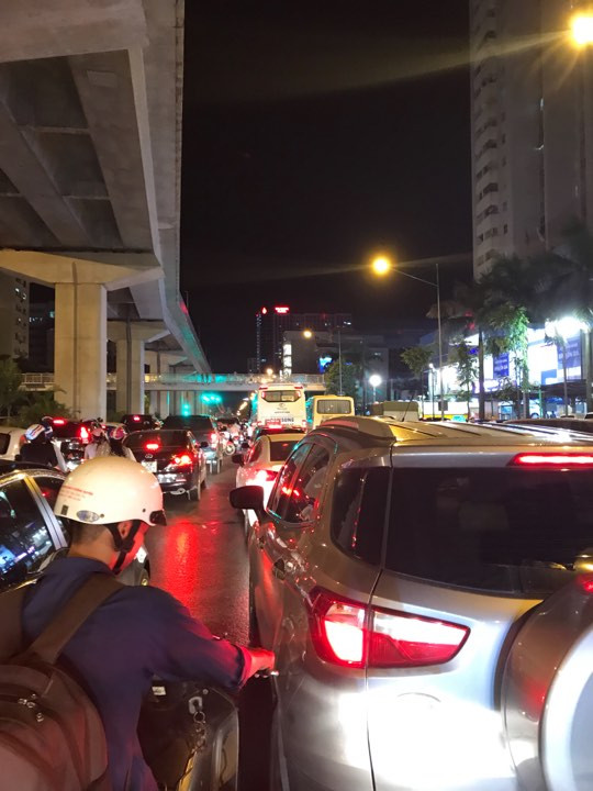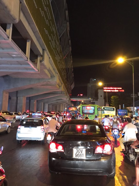 Đường Nguyễn Trãi (đoạn qua chợ Phùng Khoang) đến thời điểm 19h30 vẫn xảy ra tình trạng ùn tắc. Ảnh: Minh Hoàng