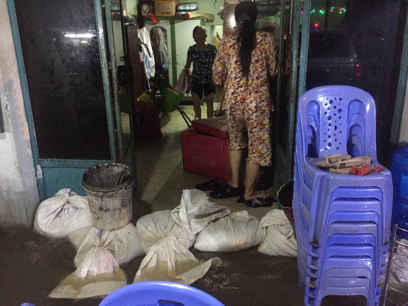 Nhiều nhà dân phải dùng bao cát để chắn nước trước cửa.