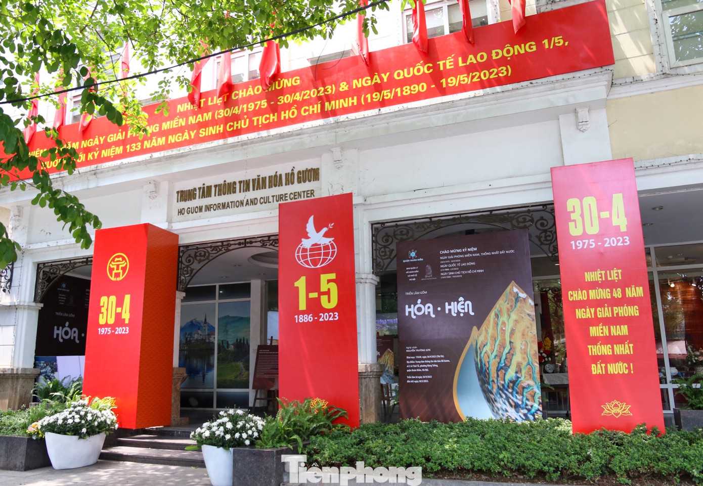 | Rất nhiều trụ sở, cơ quan làm việc cũng trang hoàng rực rỡ chào mừng ngày đại lễ 30/4 và quốc tế lao động 1/5. |