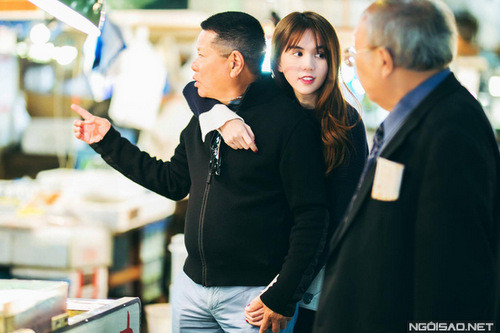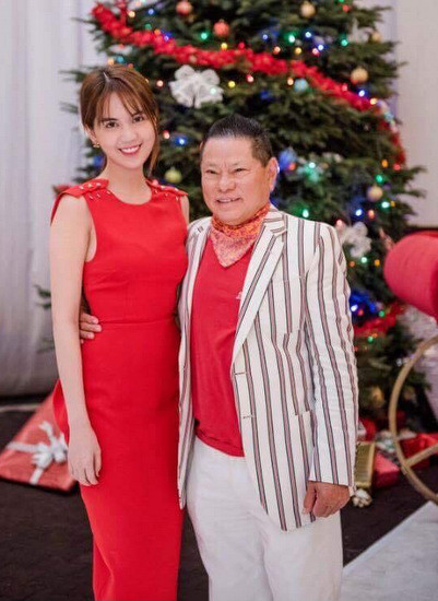 Mối quan hệ của họ chỉ được biết đến rộng rãi khi Ngọc Trinh sang Mỹ thăm người yêu ngày 12/12/2016. Tỷ phú 72 tuổi đã tổ chức một buổi tiệc lớn tại nhà riêng để ra mắt bạn gái với đối tác, bạn bè và gia đình. Trong ảnh: cả hai mặc đồ cùng tông, tạo dáng tình tứ bên nhau.
