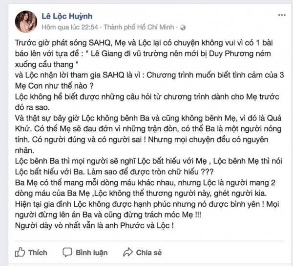 Qua sự việc này, Duy Phước và Lê Lộc cũng lên tiếng mong mọi người thôi chỉ trích ba mẹ của mình vì đó đã là chuyện quá khứ và bây giờ ai cũng có cuộc sống riêng.