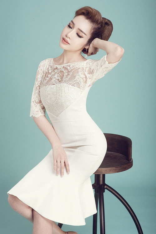 Trong bộ ảnh mới, Elly Trần khoe khả năng diễn xuất trước ống kính với những trang phục thanh lịch, gợi cảm. Váy ren bó sát giúp tôn đường cong của cô.