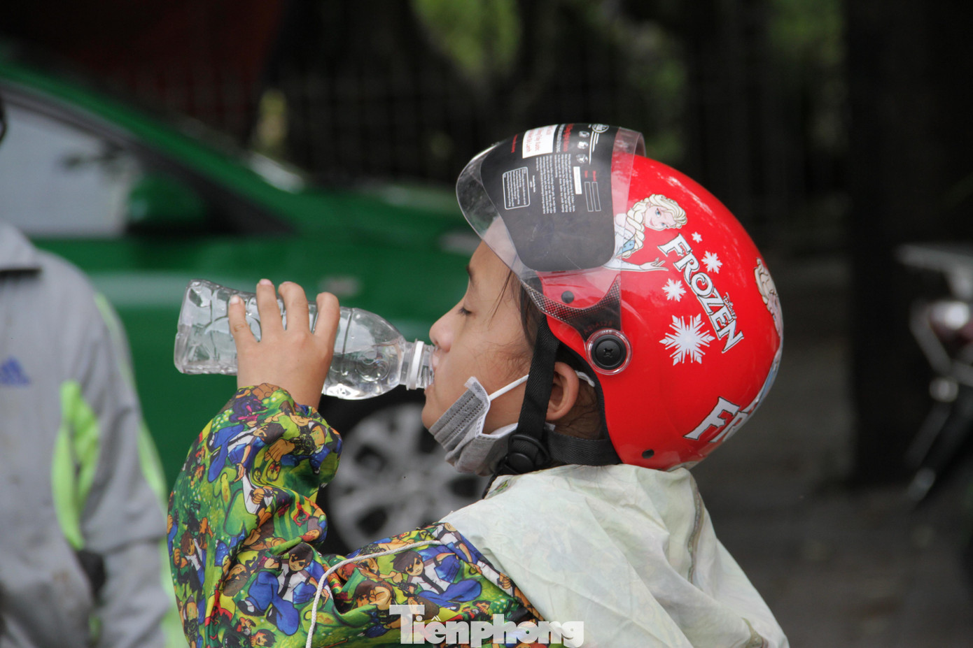 Trong lúc chờ các ông bố khai báo y tế, những đứa trẻ được lực lượng trực ở chốt kiểm soát mang sữa, bánh mì cho ăn. Mệt nhoài sau chuyến hành trình dài, những đứa trẻ chẳng còn thiết trêu đùa nhau. Chúng ngồi bệt xuống nền đất, có em tranh thủ chợp mắt sau hành trình trắng đêm cùng bố mẹ chạy xe máy về quê.