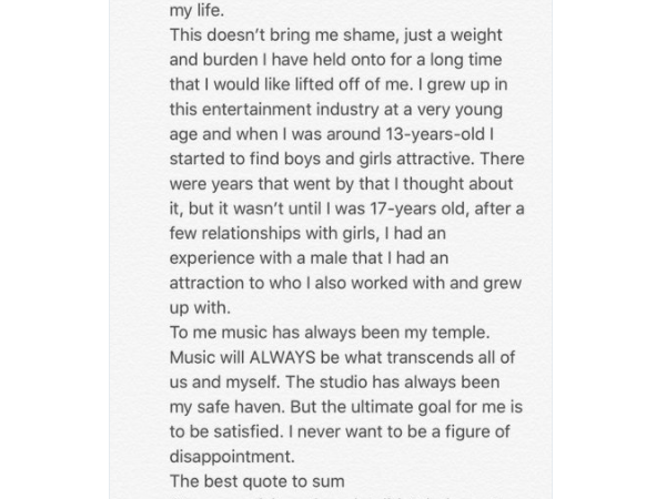 "Trước hết, tôi muốn nói rằng tôi yêu tất cả mọi người. Có một vài điều tôi nghĩ mình cần phải nói vì tôi cảm thấy nó quan trọng, tôi đã che giấu con người thật sự của mình hơn nửa cuộc đời rồi. Điều này không làm tôi xấu hổ gì cả, chỉ là tôi cảm thấy nó như một gánh nặng mà tôi đã phải vác trong một thời gian rất lâu, và bây giờ thì tôi muốn trút bỏ gánh nặng đó. Tôi lớn lên trong ngành công nghiệp giải trí từ khi còn rất trẻ, từ năm 13 tuổi tôi đã cảm thấy mình thích nam - nữ như nhau. Đã có những năm tôi nghĩ về điều đó, nhưng phải đến năm 17 tuổi sau khi tôi đã có một vài mối quan hệ với các bạn nữ, thì tôi mới có một khoảnh khắc với một người nam mà tôi đã làm việc và lớn lên cùng.
