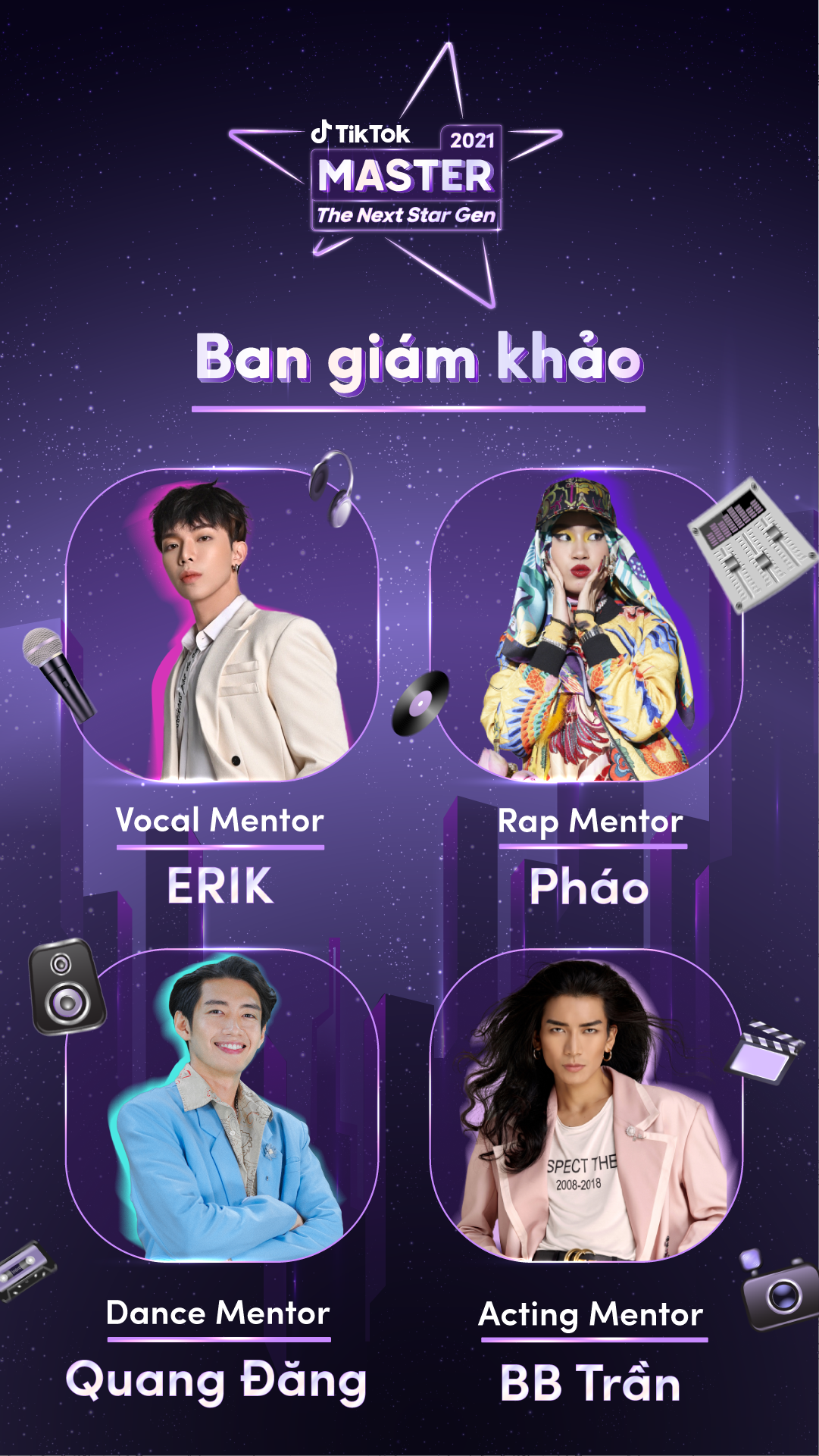 TikTok Master 2021 - The Next Star Gen là cuộc thi dành cho các TikToker trên đa dạng các lĩnh vực nội dung giải trí: Diễn xuất, Nhảy, Hát và Rap. Trong giai đoạn khởi động, những gương mặt trong ban giám khảo đều khiến khán giả trẻ thích thú. Bởi cả Erik, Quang Đăng, BB Trần và Pháo đều là những cái tên nổi bật ở lĩnh vực mà họ đảm nhận.