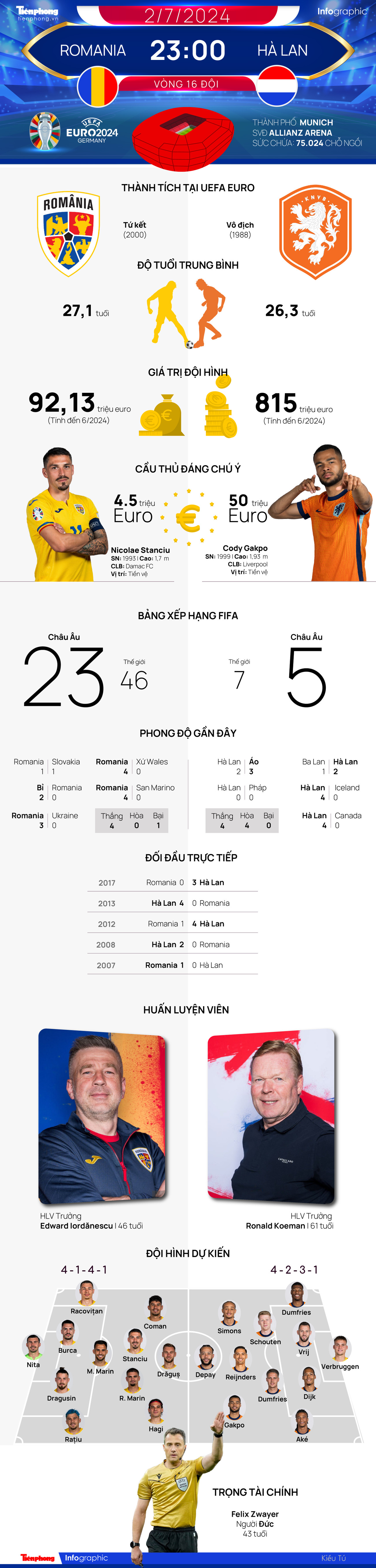 TPO - Romania và Hà Lan sẽ có cuộc so tài lúc 23 giờ ngày 2/7 trong khuôn khổ EURO 2024. Cả hai đội tiến vào vòng 1/8 bằng những cách đầy bất ngờ. Romania vượt qua vòng bảng với tư cách đội đứng đầu, còn Cơn lốc màu da cam phải nhờ đến suất vé vớt.