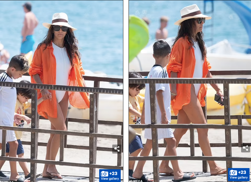 | Nữ diễn viên "Bà nội trợ kiểu Mỹ" được trông thấy bế bồng con trai 4 tuổi Santiago Enrique Bastón trên bãi biển ở Marbella trong kỳ nghỉ mới đây. |