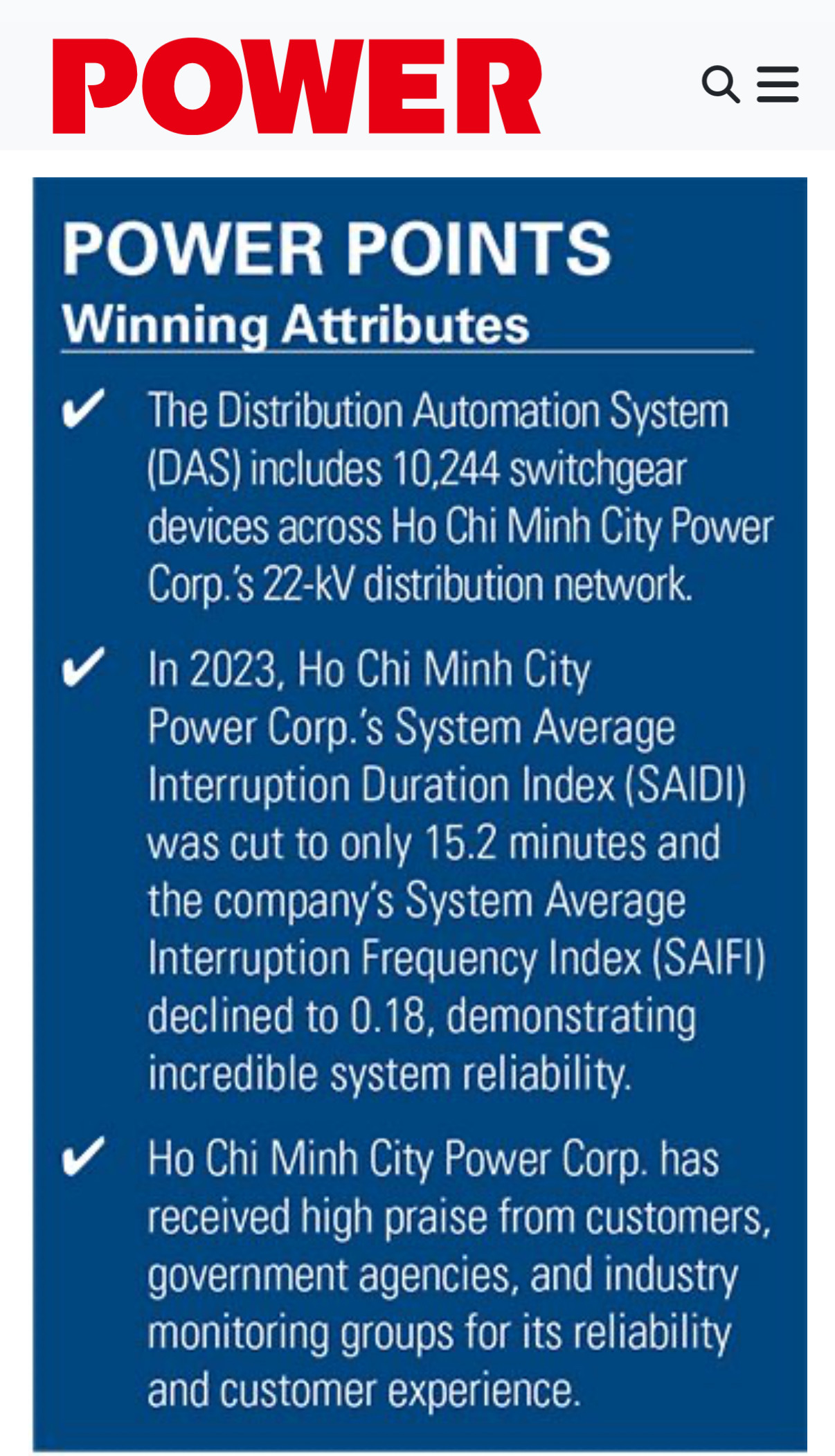 Đồng thời, EVNHCMC cũng đã nhận được Giải thưởng hạng mục “Tự động hóa trong Lưới điện thông minh” của tạp chí Power Magazine - Mỹ. Dự án Lưới điện thông minh (DAS) hỗ trợ giảm tần suất, thời gian lao động cũng như mức độ phức tạp của công việc, qua đó giúp nâng cao mức độ an toàn tổng thể cho người lao động đặc biệt là trong điều kiện thời tiết khắc nghiệt. Tại TPHCM, sự cố lưới điện phân phối phần lớn tập trung vào các mùa nắng nóng, cao điểm hoặc mưa bão vì vậy thường gây thêm nhiều mối nguy hiểm tiềm tàng cho người lao động trong quá trình xác định và xử lý sự cố.