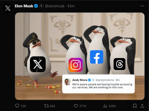Ông chủ của Twitter cũng đăng một dòng tweet rằng: "Nếu bạn đọc được bài đăng này thì đó là bởi vì các máy chủ của chúng tôi vẫn đang làm việc". Ngay khi khắc phục xong sự cố, Mark Zuckerberg cũng đăng một trạng thái trên X đầy mùi "hơn thua" với Elon Musk: "Vấn đề đã được giải quyết. Bạn có thể rời cái ứng dụng "lởm" này rồi".