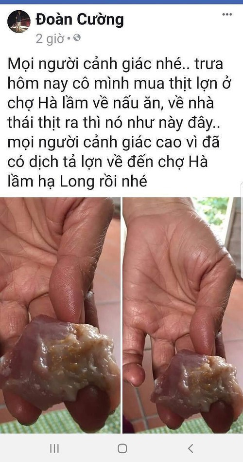 Theo đó, tối 10/3, tài khoản facebook Đoàn Cường đăng bài viết với nội dung: "Mọi người cảnh giác nhé… trưa hôm nay cô mình mua thịt lợn ở chợ Hà Lầm về nấu ăn, về nhà thái thịt ra thì nó như thế này đây… Mọi người cảnh giác cao vì đã có dịch tả lợn về đến chợ Hà Lầm, Hạ Long rồi nhé”. Kèm theo đó là hình ảnh bàn tay cầm miếng thịt lợn màu nhợt nhạt. Bài viết này đã nhận được rất nhiều like, chia sẻ và bình luận của của cộng đồng mạng.