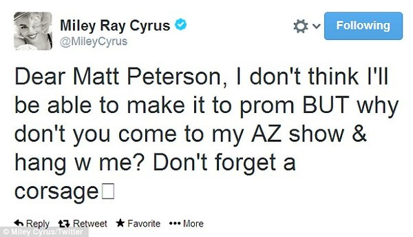 Khi Miley xem đoạn clip này cảm thấy rất phấn khích và bất ngờ nhưng cô đã lịch sự từ chối lời đề nghị của Matt. Cô đăng trên Twitter: ‘Matt Peterson thân mến, tôi không nghĩ mình có thể đến đêm dạ hội đó được, nhưng bạn hãy đến show diễn ở Arizona của tôi và chúng ta sẽ cùng trò chuyện nhé.’