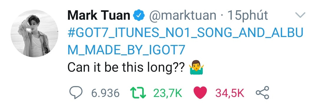 Chủ tịch Mark Entertainment tích cực quảng bá cho "gà cưng" GOT7 Từ sự việc trên, các fan của GOT7 đùa răng có lẽ nhóm đã chuyển công ty chủ quản từ JYP thành Mark Entertainment vì Instagram của anh chàng còn đăng bài quảng bá nhiều hơn gấp nhiều lần so với Instagram của nhóm. Dù bận rộn với lịch trình quảng bá, thành viên GOT7 cũng kịp đăng 9 bài trên Instagram cá nhân và 13 bài trên twitter để giới thiệu album mới, trong đó có cả hình ảnh đếm ngược lẫn cập nhật tình hình trên các bảng xếp hạng.