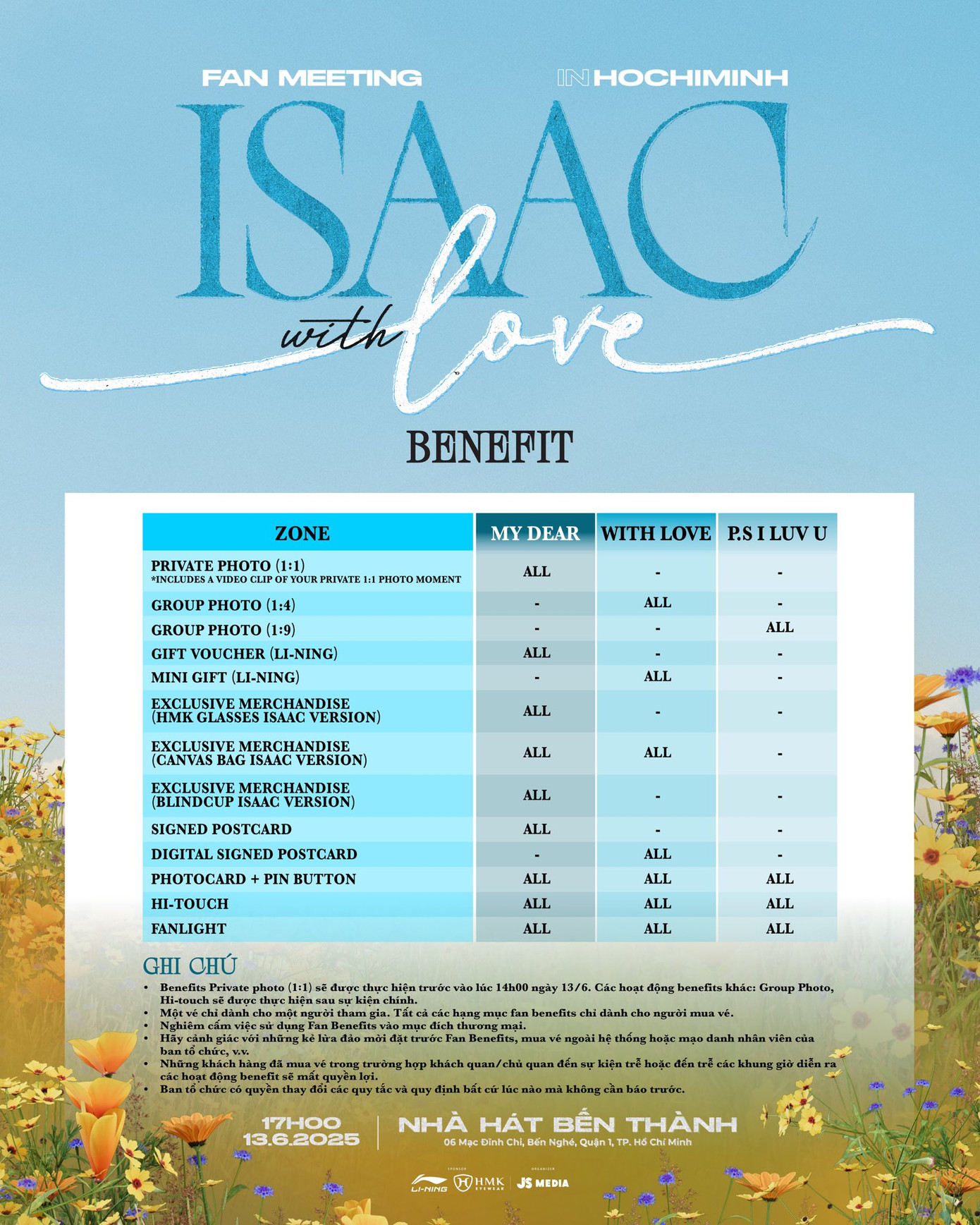Ngay trong thông báo cổng đặt vé của “ISAAC WITH LOVE” FAN MEETING sẽ chính thức mở trên Ticket Box từ 12h ngày 20/5, Isaac cũng đã bật mí về hạng vé, cũng như những quyền lợi dành cho fan.