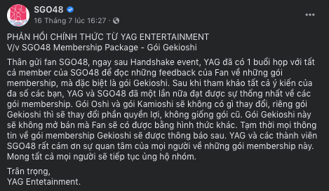 Fanpage chính thức của SGO48 đã có những phản hồi về các gói membership. Cần nhắc qua, gói membership không hề là câu chuyện xa lạ với fan K-Pop khi mà những nhóm nhạc nổi tiếng đều sử dụng các gói membership với thời hạn trung bình 1 năm dành cho người hâm mộ. Theo đó, với quyền lợi của membership, fan có thể đặt vé concert dễ hơn, thưởng thức những nội dung độc quyền, được ưu tiên mua fan goods chính hãng do công ty quản lý của idol sản xuất… Nhưng hầu hết đều không có những quyền lợi mang tính riêng tư. Hơn nữa, giá thành cho các gói membership đều rất “hạt dẻ”, chỉ khoảng hơn 1 triệu đồng/ năm.