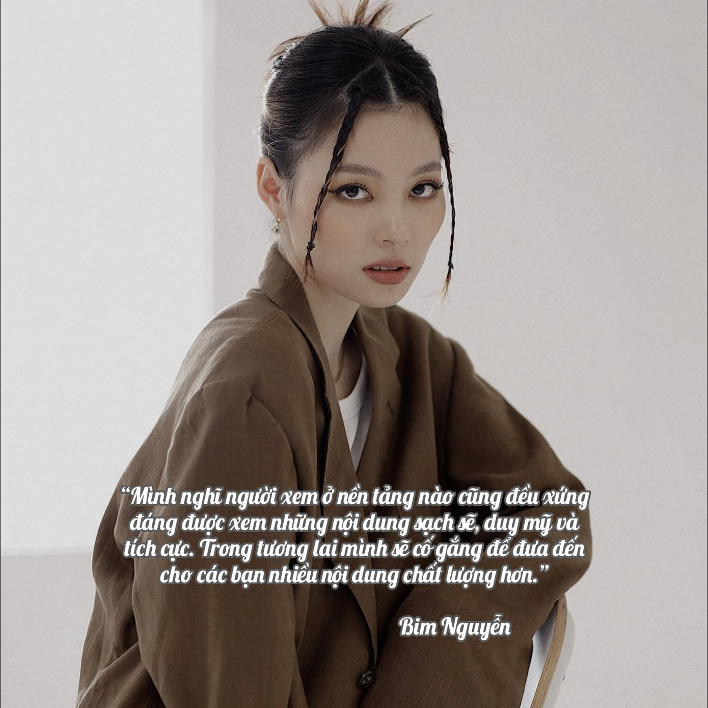 “Mình nghĩ người xem ở nền tảng nào cũng đều xứng đáng được xem những nội dung sạch, duy mỹ và tích cực. Trong tương lai mình sẽ cố gắng đưa đến cho các bạn nhiều nội dung chất lượng hơn”, Bim Nguyễn chia sẻ.