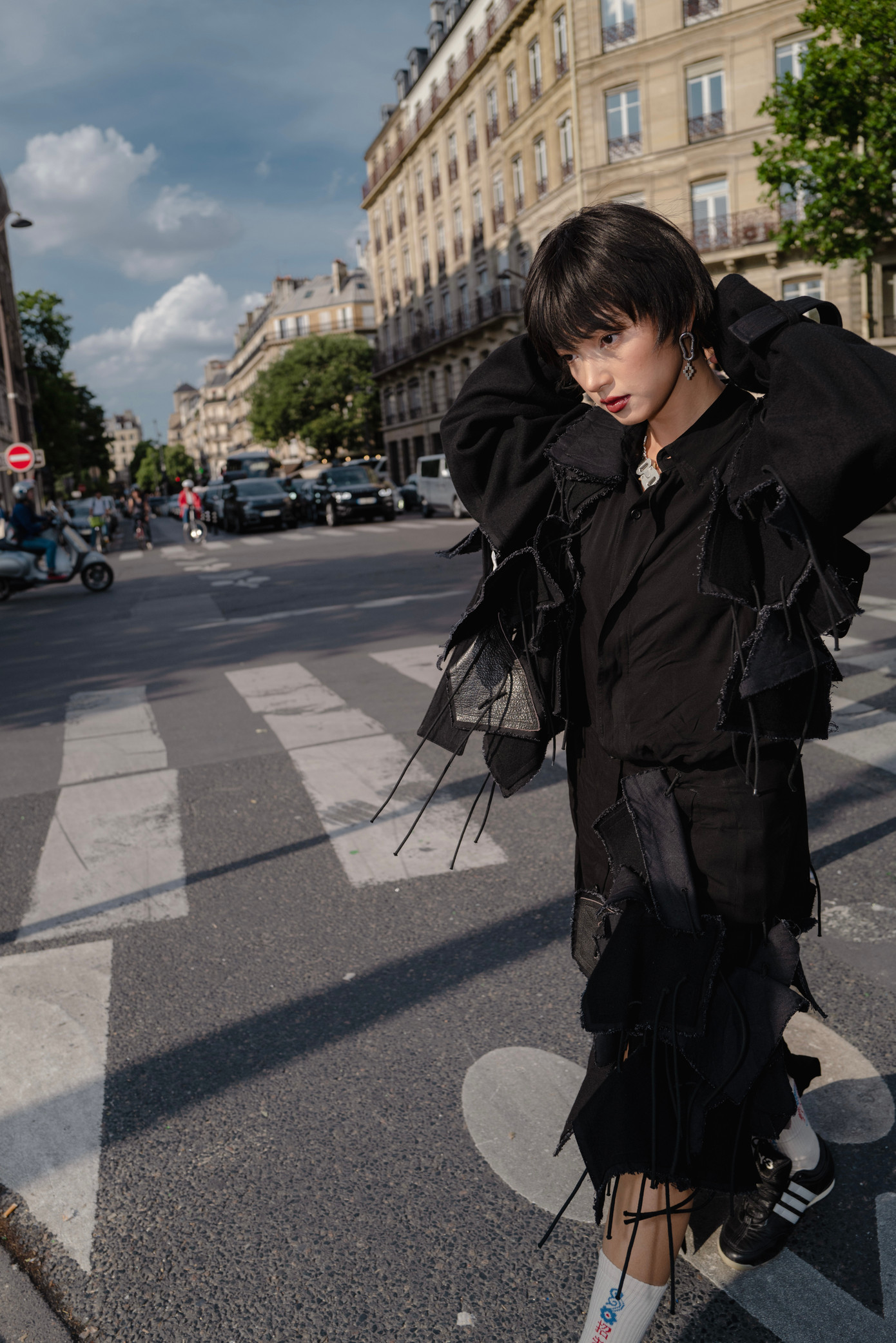 Lần này, Châu Bùi tiếp tục khiến V-net ấn tượng với các phong cách và thần thái khác biệt. Người đẹp diện trang phục đen với mái tóc đen nguyên bản, tạo điểm nhấn trên tổng thể trang phục bằng đôi tất trắng. Thẩm mỹ thời trang streetwear của Châu Bùi cũng nhận được cái gật đầu từ giới mộ điệu trong và ngoài nước.