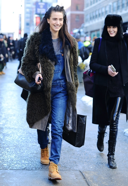 Một cách mặc theo hai xu hướng hot của năm ngoái: quần yếm và áo khoác lông oversize.