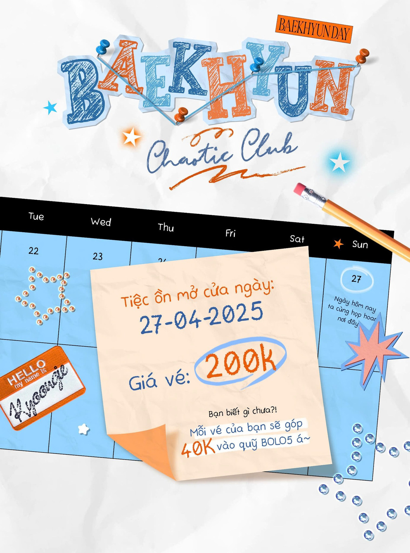 Trước thềm sinh nhật lần thứ 33 của Baekhyun vào ngày 6/5 tới, mới đây FC Moonlight Baek - với hơn 204K thành viên theo dõi, đã gửi lời mời “họp lớp” tới các V-Eri. Buổi offline mang tên Baekhyun Chaotic Club được xem là cuộc gặp của Hội người ồn Việt Nam, nơi các Eri dù là hướng nội hay hướng ngoại đều sẵn sàng ồn vì Baekhyun.