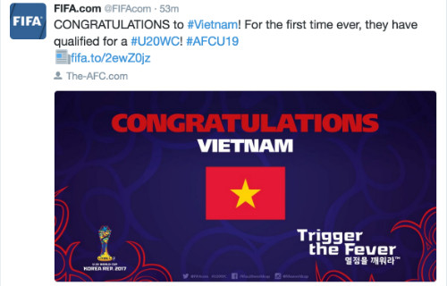 “Xin chúc mừng Việt Nam. Đây là lần đầu tiên đội bóng này giành quyền tham dự U20 World Cup”, lời chúc mừng được đăng kèm với hình quốc kỳ Việt Nam.