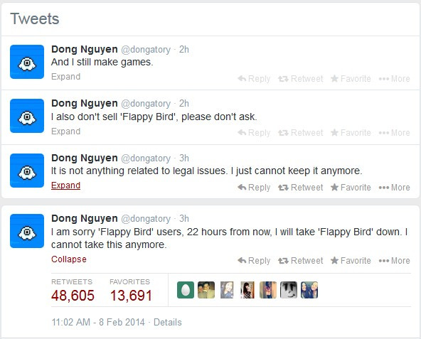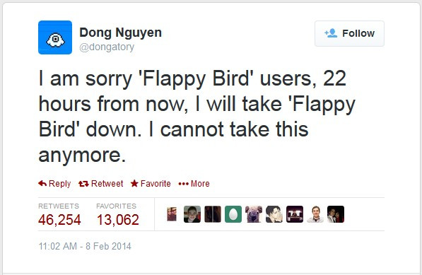 Cụ thể, Nguyễn Hà Đông với nickname Dong Nguyen trên Twitter đã công bố, anh sẽ đóng ứng dụng này bắt đầu từ ngày hôm nay.