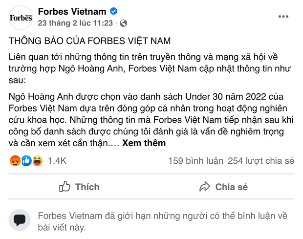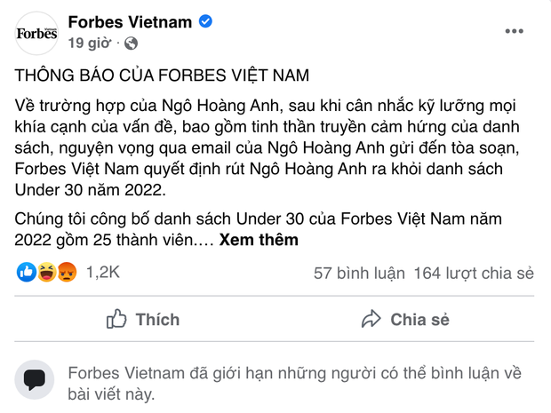 Trên trang fanpage chính thức của Forbes Việt Nam, nhiều netizen đã phát hiện tạp chí này đã tiến hành khoá phần bình luận ba bài thông báo về vụ việc của Ngô Hoàng Anh. Ở những bài đăng khác, phần bình luận vẫn như bình thường. Ngoài ra, những bình luận thể hiện thái độ bức xúc, trái chiều ở các bài đăng gần đây của Forbes cũng bị xóa bỏ.