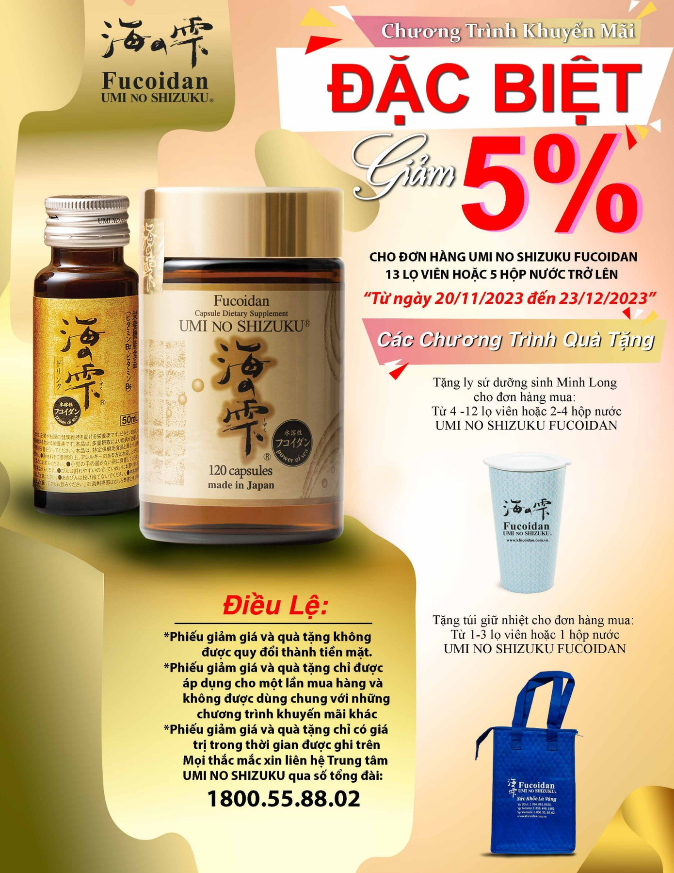 Để tri ân sự tin tưởng và ủng hộ trong suốt thời gian qua, Công ty TNHH Umi No Shizuku gửi đến quý khách hàng chương trình khuyến mại đặc biệt áp dụng từ ngày 20/11/2023 đến ngày 23/12/2023.