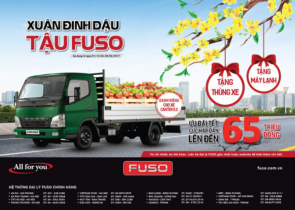 Theo đó, khách hàng khi mua xe tải nhẹ FUSO Canter 8.2 tấn sẽ được tặng ngay thùng xe trị giá 50 triệu đồng cùng máy lạnh trị giá 15 triệu đồng và nhiều phần quà hấp dẫn khác.