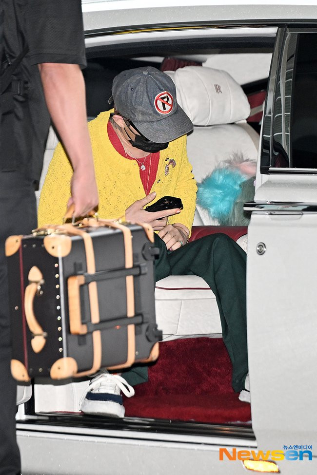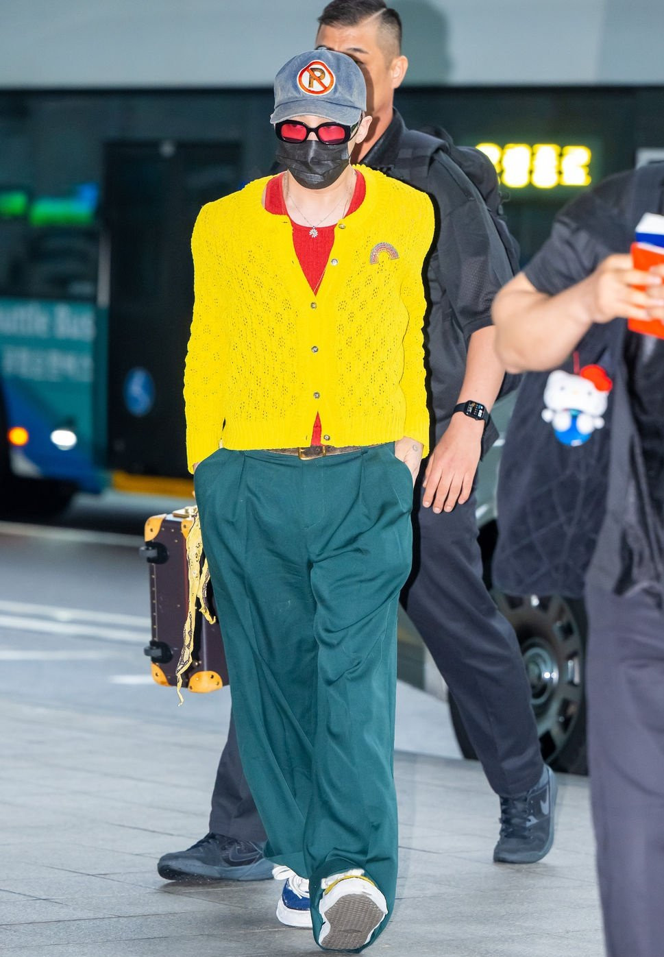 Chàng trưởng nhóm BIGBANG ngày hôm nay lựa chọn phong cách trang phục "kín cổng cao tường" với áo khoác cardigan, mũ lưỡi trai, kính râm và quần dài. Màu sắc của outfit nổi bật với hai tone màu đỏ và vàng khiến nhiều fan nói vui là "nhìn phát biết ngay sắp đến Việt Nam".