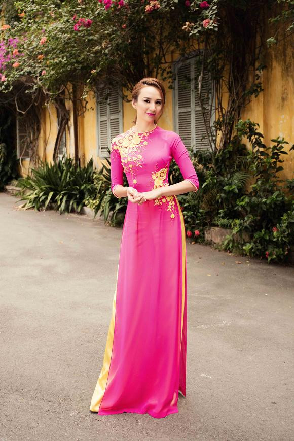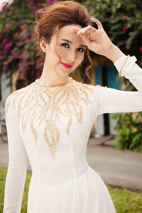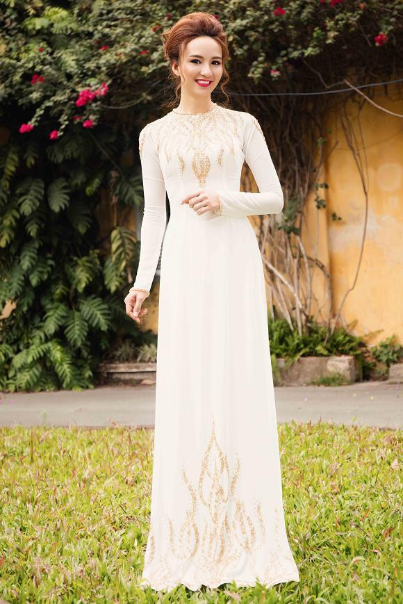 Hoa hậu Du lịch Việt Nam 2008 khoe nhan sắc mặn mà và xinh đẹp trong những mẫu thiết kế áo dài của nhà thiết kế kiêm chuyên gia trang điểm Huỳnh Lợi.