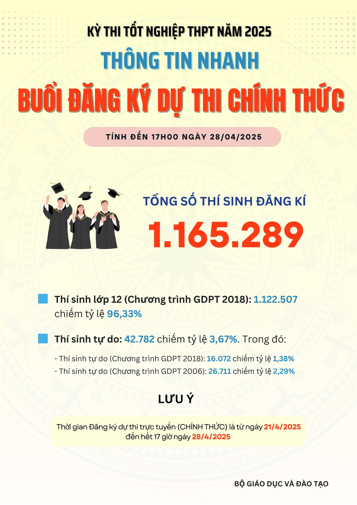Theo số liệu thống kê được Bộ GD&ĐT công bố tối 28/4, cả nước có 1.165.289 thí sinh đăng ký dự thi trên hệ thống (năm 2024 là 1.067.391). Trong đó, thí sinh lớp 12 (Chương trình GDPT 2018) là 1.122.507 (chiếm 96,33%).