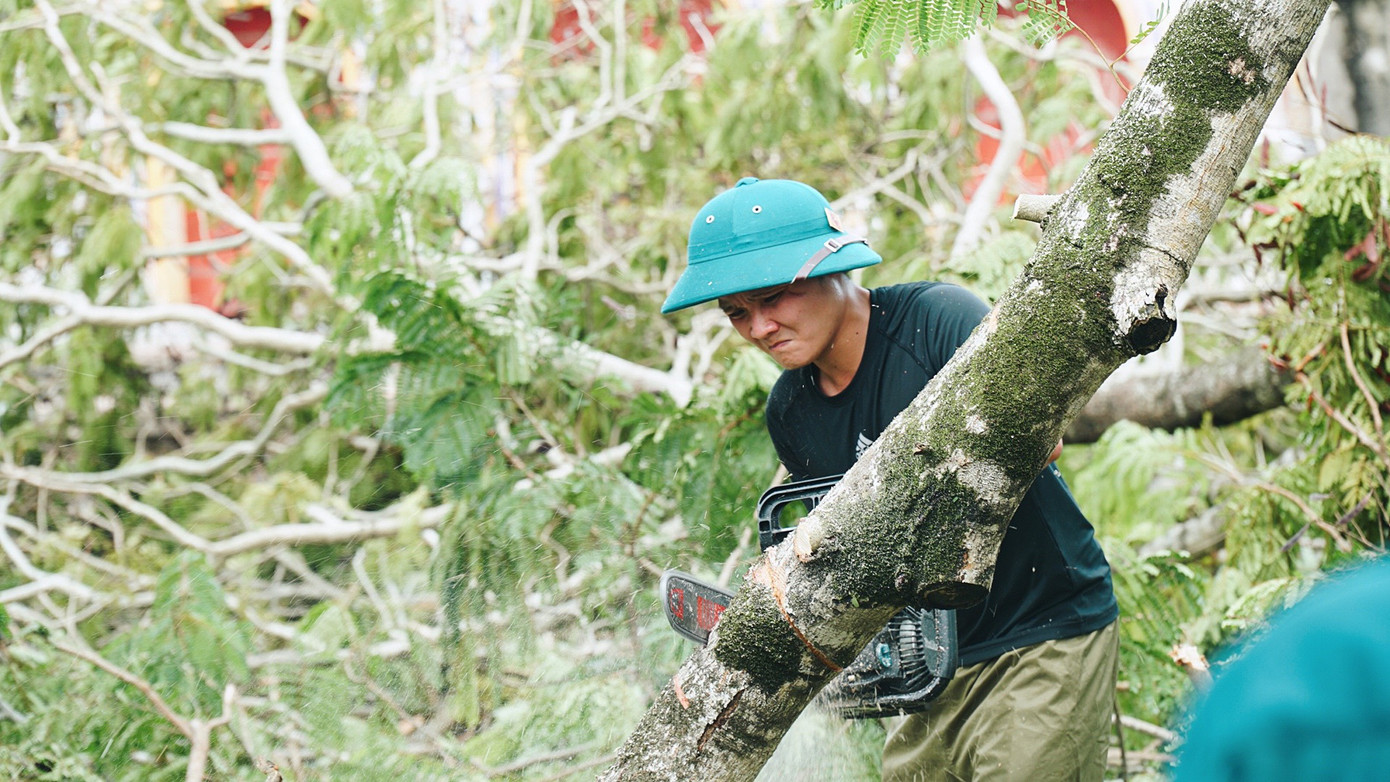 Gần 1.500 đoàn viên thanh niên, kết hợp nhiều cán bộ, chiến sĩ thuộc lực lượng công an, quân đội tại TT-Huế vẫn miệt mài thu dọn cây xanh bị đổ ngã.